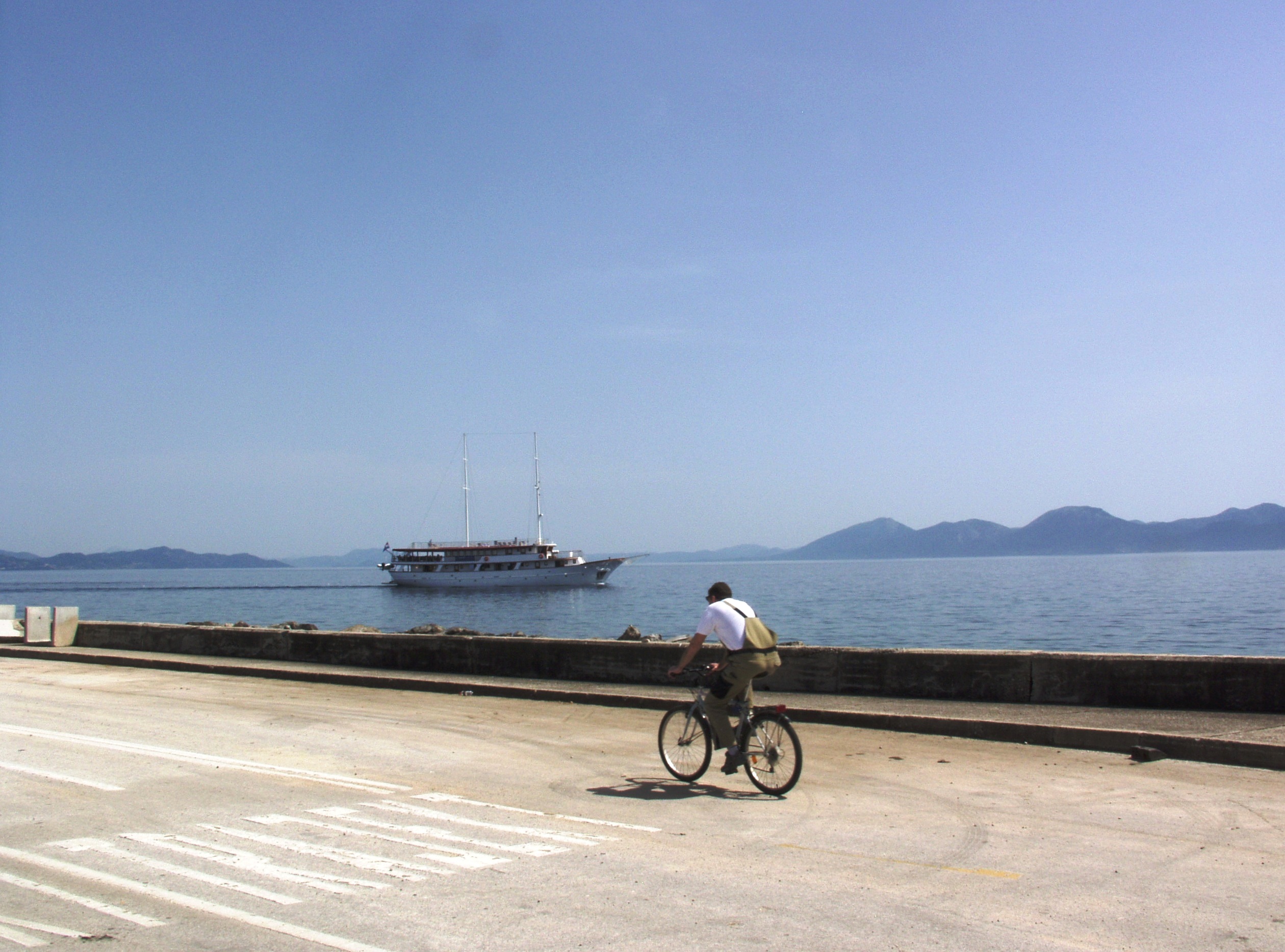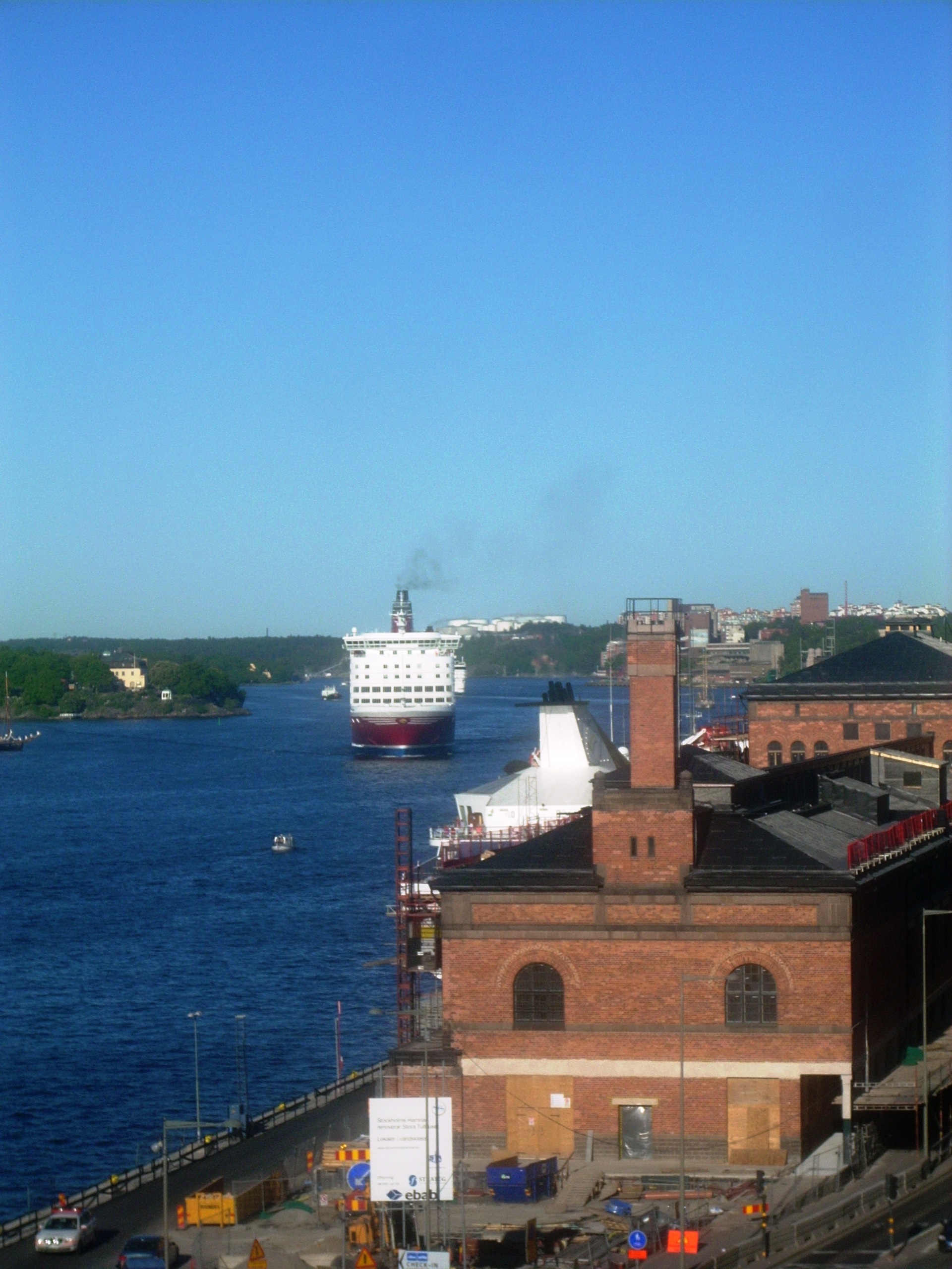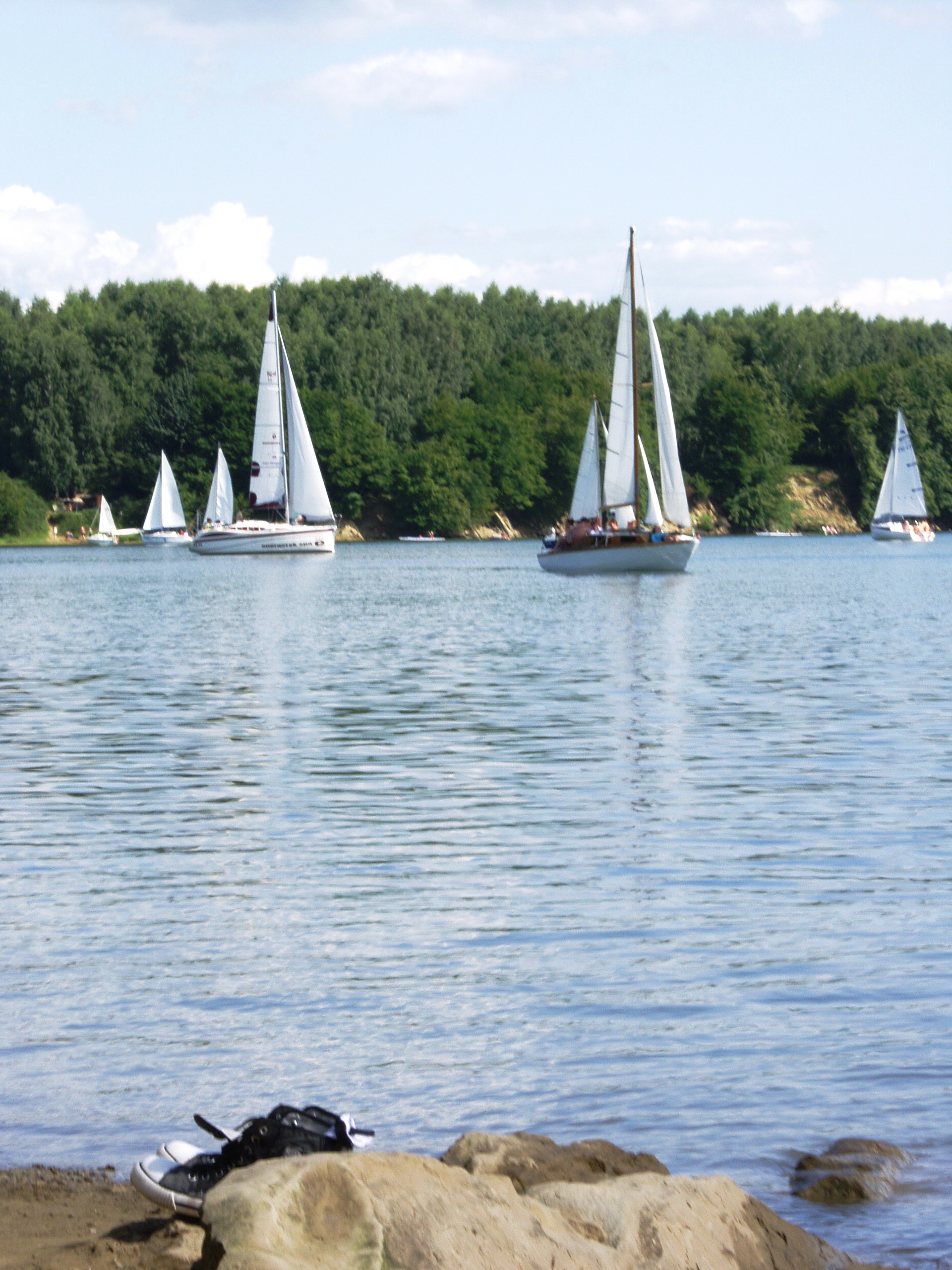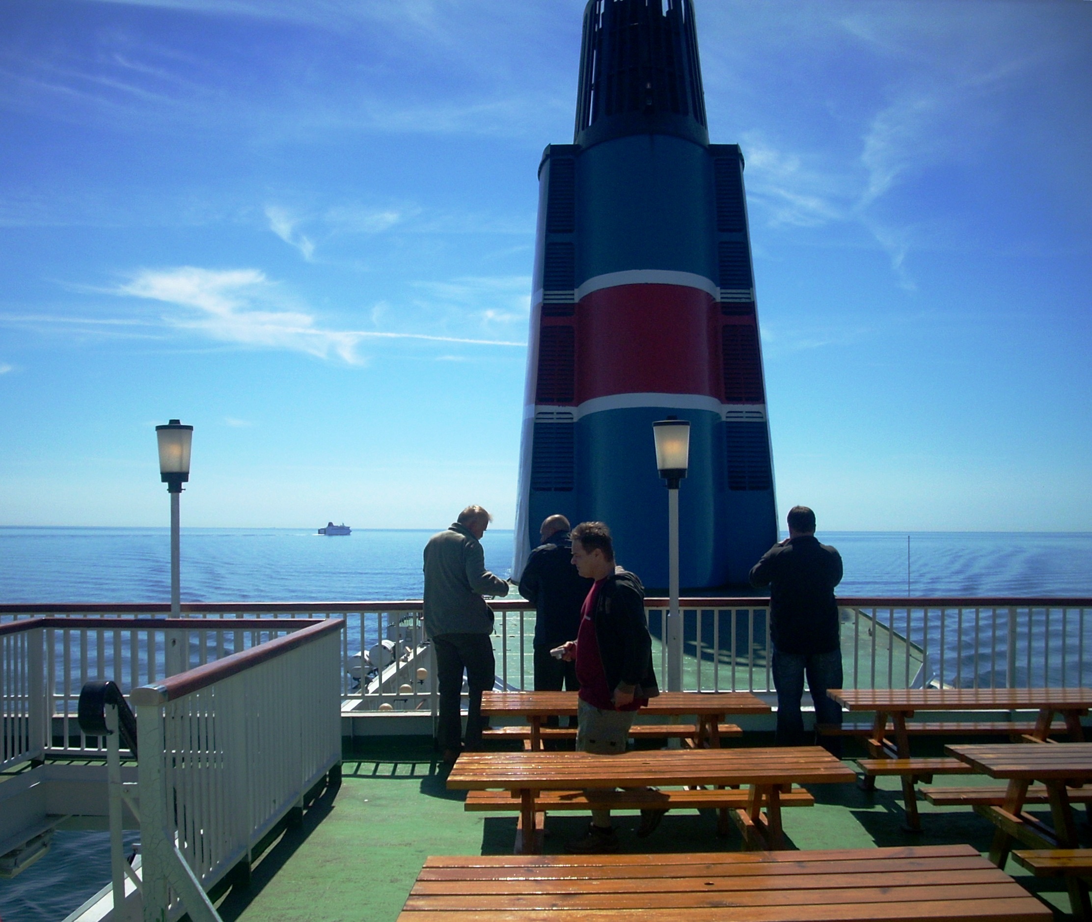 wpatrując się sunącą poniżej wielką brudną wodę i barkę